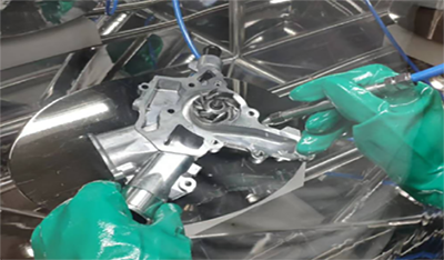 利用超聲波在液體中的空化作用、加速度作用以及直進(jìn)流作用對(duì)液體和污染物直接、間接的作用,使氣泡周圍產(chǎn)生1012-1013pa的壓力,破壞不溶性顆粒物附著性,使它們分化在液體中,蕞終實(shí)現(xiàn)零件清潔度污染物顆粒的清洗。